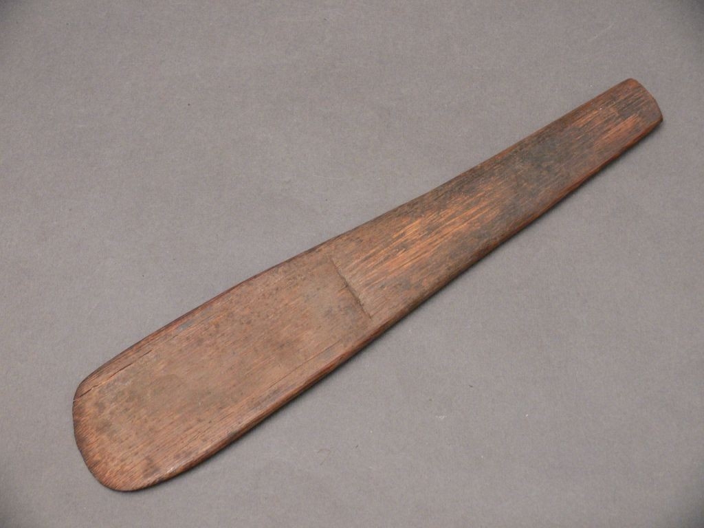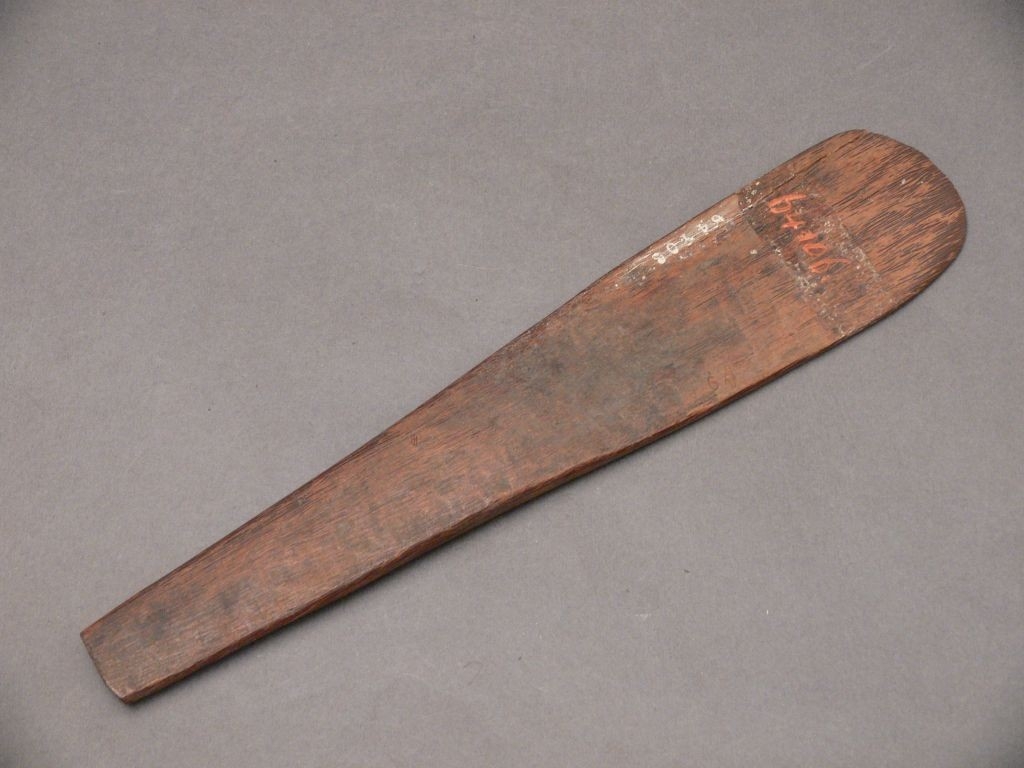 Hosszú téglalap alakú, alul szélesebb és lekerekített, felül keskenyebb és egyenesen levágott, sötétbarna színű falapátka, amelynek alsó része elvékonyított. Bíró-jegyzet: 542.
