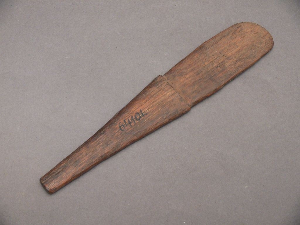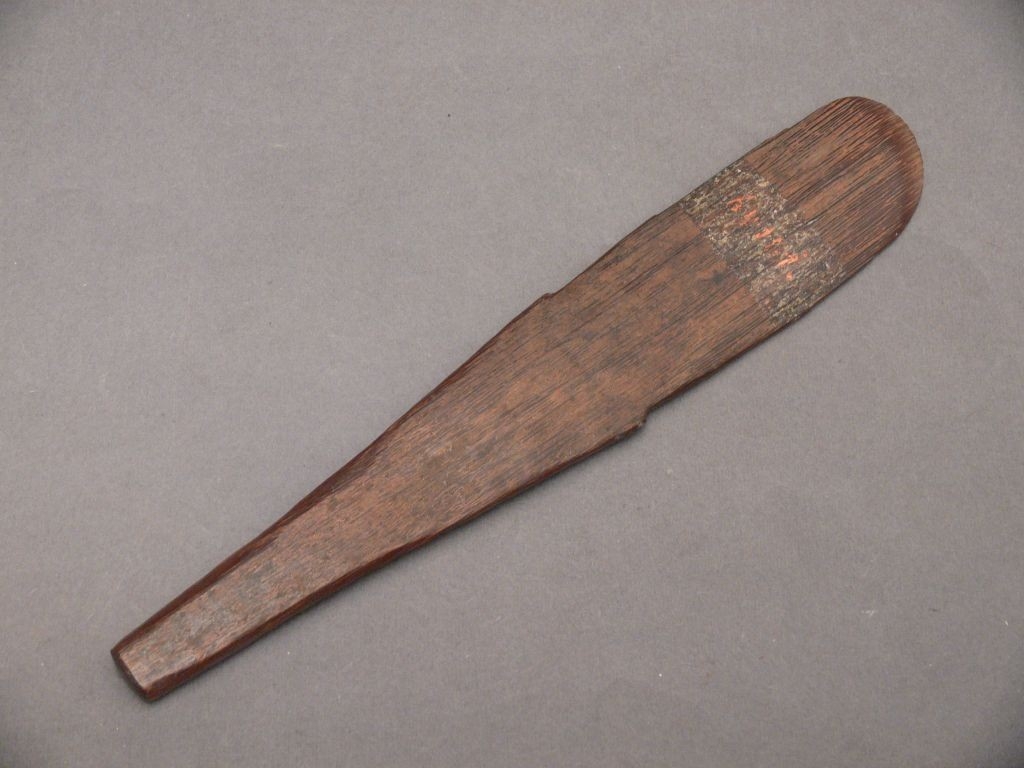 Hosszúkás téglalap alakú, lapos, sötétbarna színű, alul szélesebb és lekerekített, felül keskenyebb és egyenesen levágott falapátka. Alsó része kb. az egész falapátka felében elvékonyított. Bíró-jegyzet: 542.