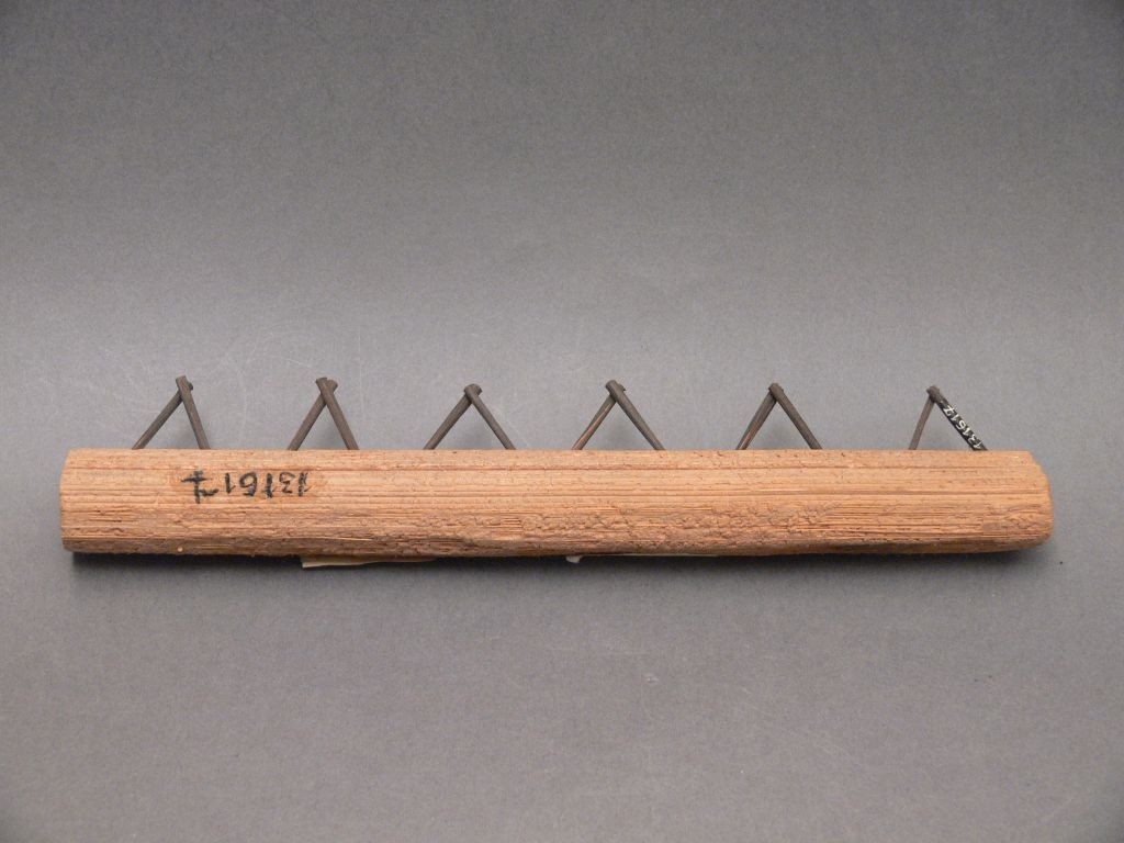 Hengeres, világosbarnás színű puha fadarab, melyen egy sorban hat pár, kettesével egymás felé forduló és így háromszögalakot képező vékony pálcika . .