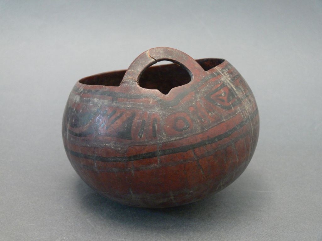 Kivájt kókuszdióból, a felső rész levágásával megformált edény. Fülét az eltávolított felső rész egy darabjának meghagyásával alakították ki. Felületét fekete sávos festés díszíti.