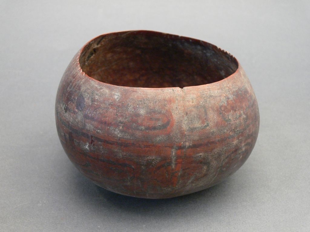 Kivájt kókuszdióból, a felső rész levágásával megformált edény. Peremén bevagdalt díszítés található. Külső felületét geometrikus motívumokból álló festés díszíti.