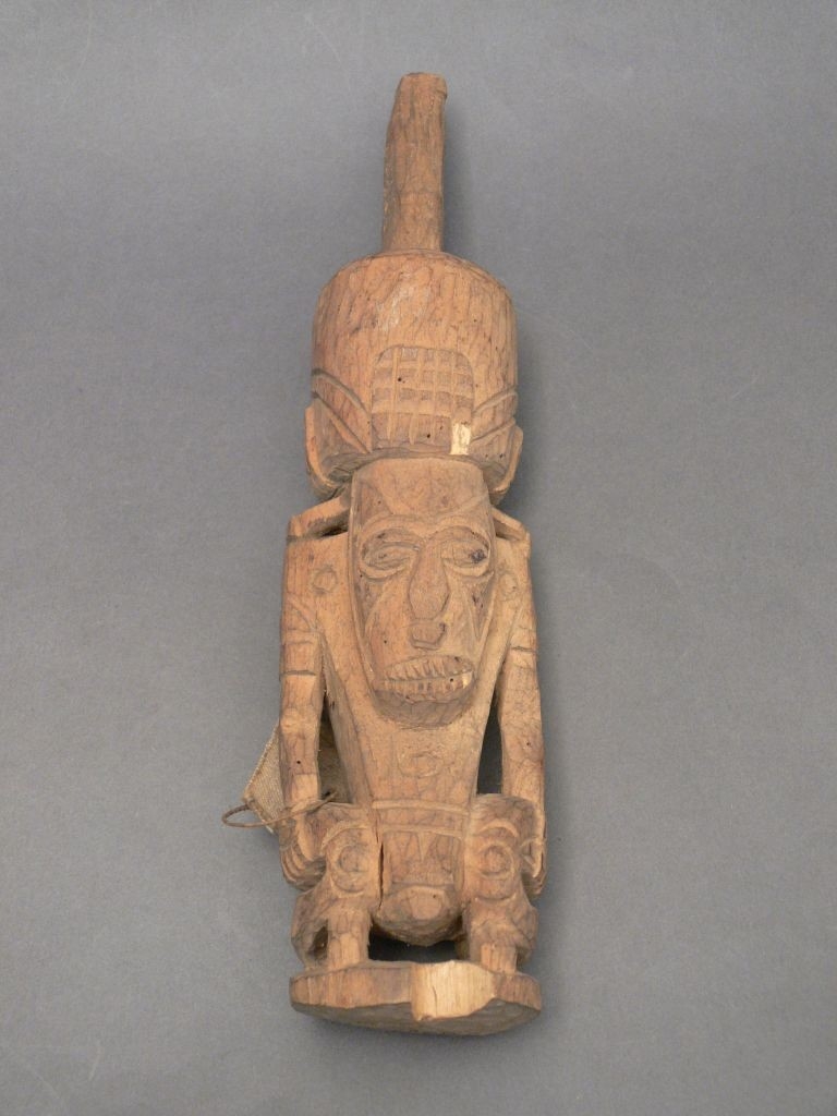 – Világos szürkéssárgás színű, festetlen, kemény faanyagból, oszlopszerűen körben faragott férfialak. Kerek, korong alakú talapzaton guggol, lábai teste alá hajlanak és a sarkok a fart érintik, lábfejein négy-négy lábujj van jelezve sima, bemélyített vonalakkal. kezei a testtől különállóan vannak faragva, kezei, ahol szintén négy-négy ujj jelzése látszik, a combra támaszkodnak. Törzse egész rövid, arcrésze, melyen az arcvonásokat és a fogakat kiemelkedően faragott vonalak jelzik, a testhez méretezve aránytalan nagy. A fej fölött henger alakú, vaskos fejdísz-féle van, amelyből vékonyabb oszlop nyúlik ki a test középvonalának meghosszabbításaként. A vállakon, a térdeken és a köldöknél kör alakú bemélyített faragás, a lapockáknál szintén mélyített ovális alak. A fejdíszen négyszögletekből álló mező és hullámvonalakban körbefutó kettős vonal látható. Füldíszei áttörten, egészen a vállakra fekszenek.