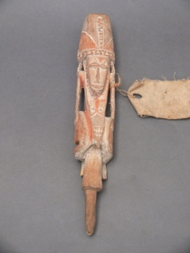 Világos színű, kemény faanyagból faragott férfialak. A szobor oszlop alakú, alsó része egy vékonyabb és egy vastagabb hengerből áll, ezen van maga alá húzott lábakkal elhelyezve az ember alakú rész. Férfijellegét penise mutatja, a testtől különállóan faragott karjai a combra támaszkodnak, ahol mind az öt ujj jelezve van. Arcrésze kiemelkedően faragott, arcvonásai szintén. Törzse szögletes és lefelé fokozatosan elkeskenyedik. Fejdísze felfelé keskenyedő hengeralak. Köldökén két kör alakú mélyített faragás van, hátán a lapockákon hasonló faragás, de ez utóbbiak spirális vonallal össze vannak kötve egymással. Tarkójánál félkörben húzódó fűrészfogakból álló dísz, fejdíszét elől középen mélyített és kiemelkedő hullámvonalas, keskeny sávban felfelé húzódó faragás díszíti. Fülbevalói áttörtek és a vállal együtt vannak kifaragva. A szobron vöröses és fehér festés nyomai láthatók.