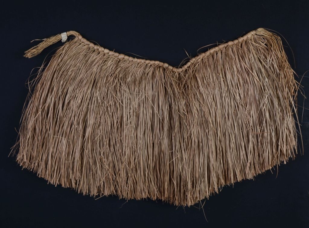 Övrésze összetekert növényi szál köteg, erről lógnak le sűrűn a sárgás színű vékony növényi szálak. Külső oldalán keskeny, hosszúkás téglalap alakú, barnás színű pálmalevél csíkok vannak.