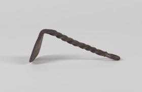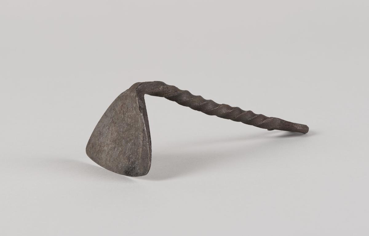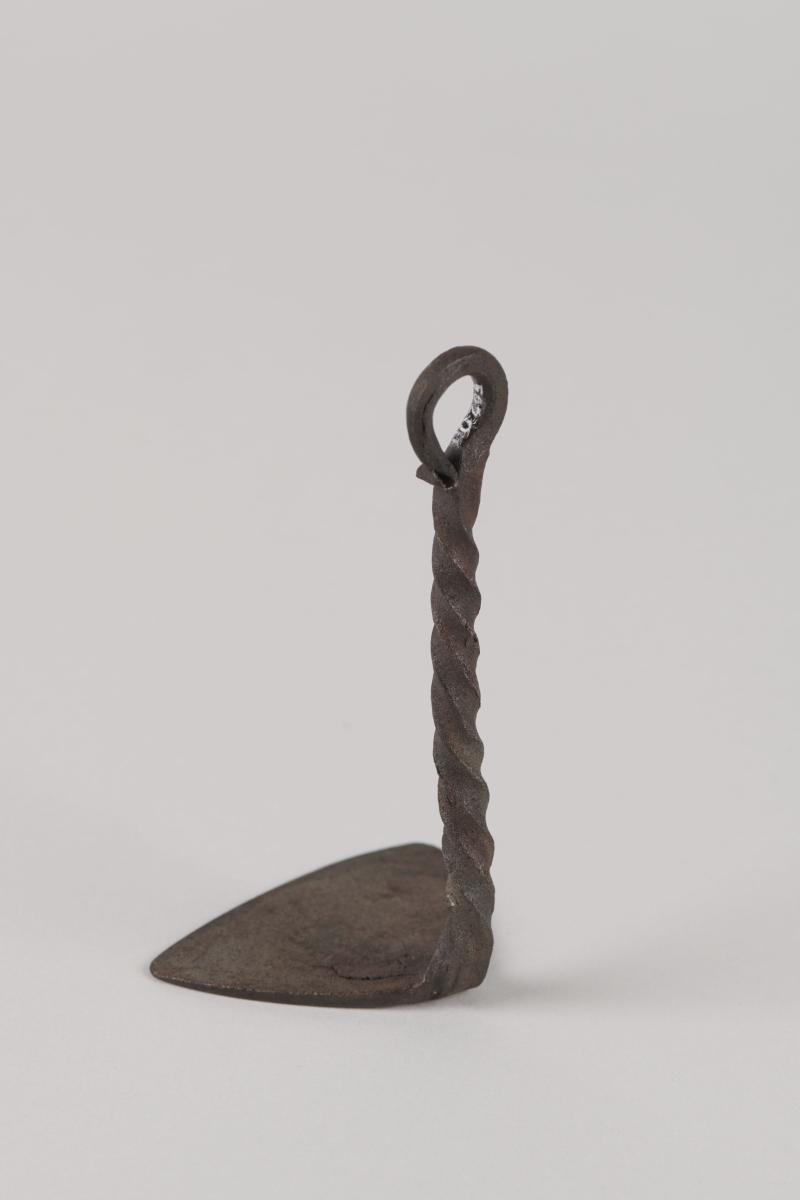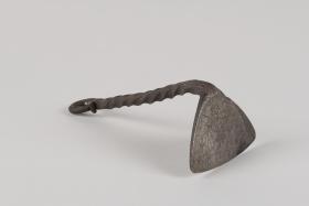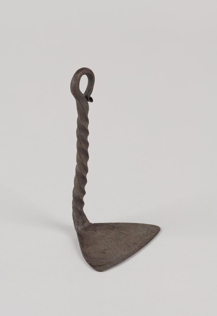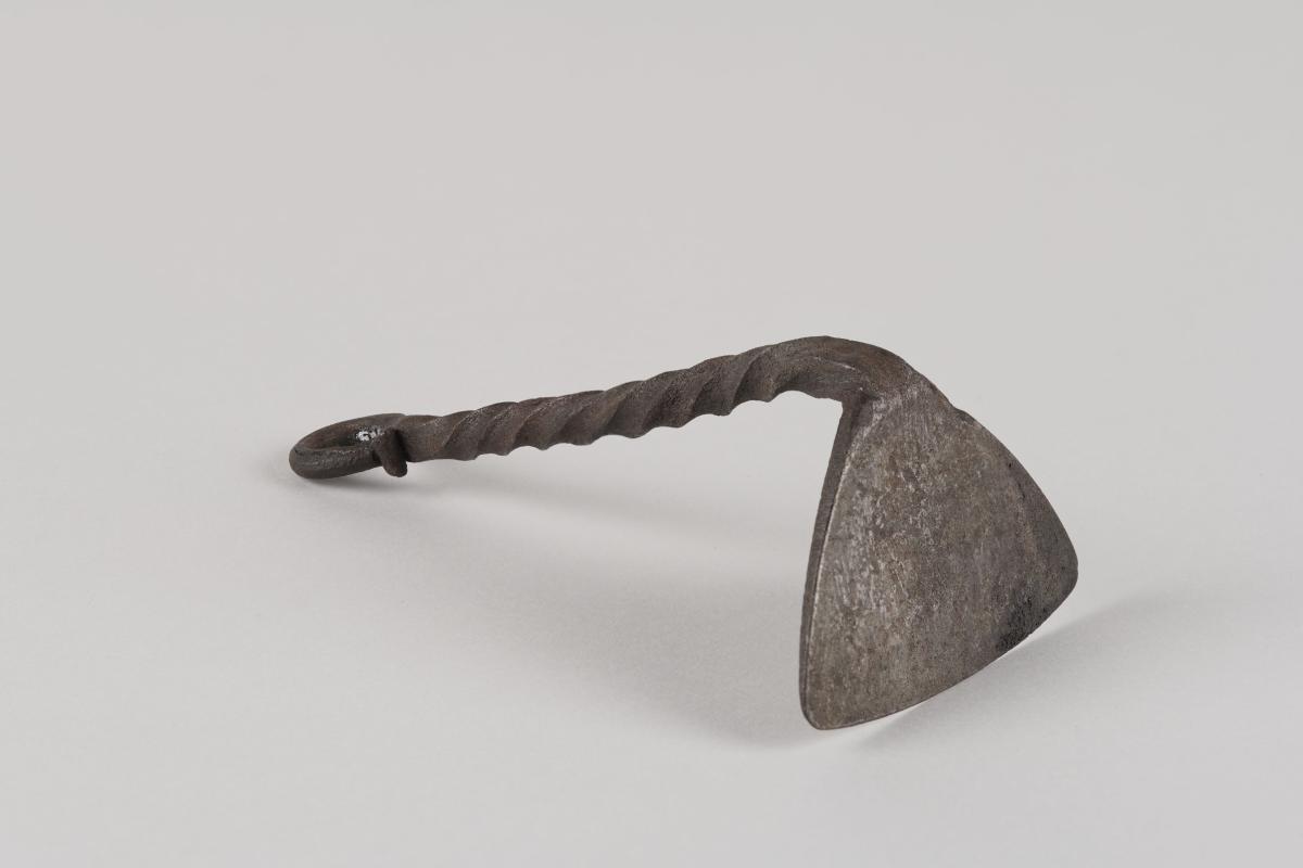 Kovácsoltvas kovászvakaró. Háromszög alakú talp közepén 90 fokban meghajlított csavart nyél, melynek vége kör alakban visszahajlított.