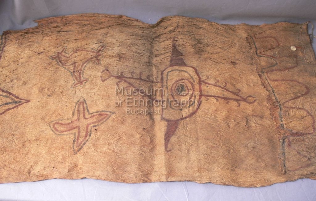 Anyaga vöröses-barna színű puhított faháncs. Kétszeresen egymásra hajtva, úgy hogy összesen három réteget képez. A külső réteg kétoldalt és alul összevarrva. A hajtáson hagyott nyíláson össze csomózott háncs csík van. Középen szem alakú ornamens, fekete és vörös színű, csillag alakú. Alatta szimmetrikusan elhelyezve tengeri csillag motívum alsó és felső szegélye vörös és fekete, hullámvonalakkal díszített. Bíró-jegyzet: 666.