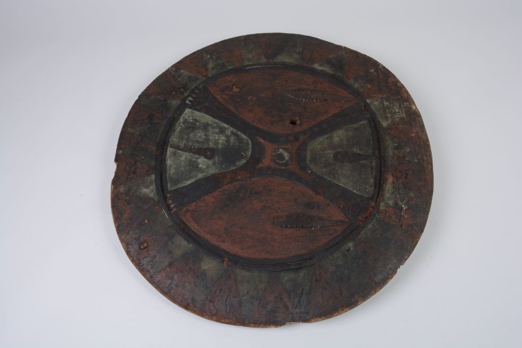 Korong alakú, vastag, nehéz faanyagból faragott lap. Külső oldalán a peremmel egyezően vájat húzódik körbe, a körön belül X alakú, kiemelkedően faragott díszítés van. Az X szárai által határolt részek váltakozva vörös és zöldes színűek. A vájat és a pajzs széle között lévő sávon háromszöges, váltakozva vörösre és zöldre festett díszítés van. Belső oldalán két törött fülrész van. A pajzs alapszíne sötétbarna.