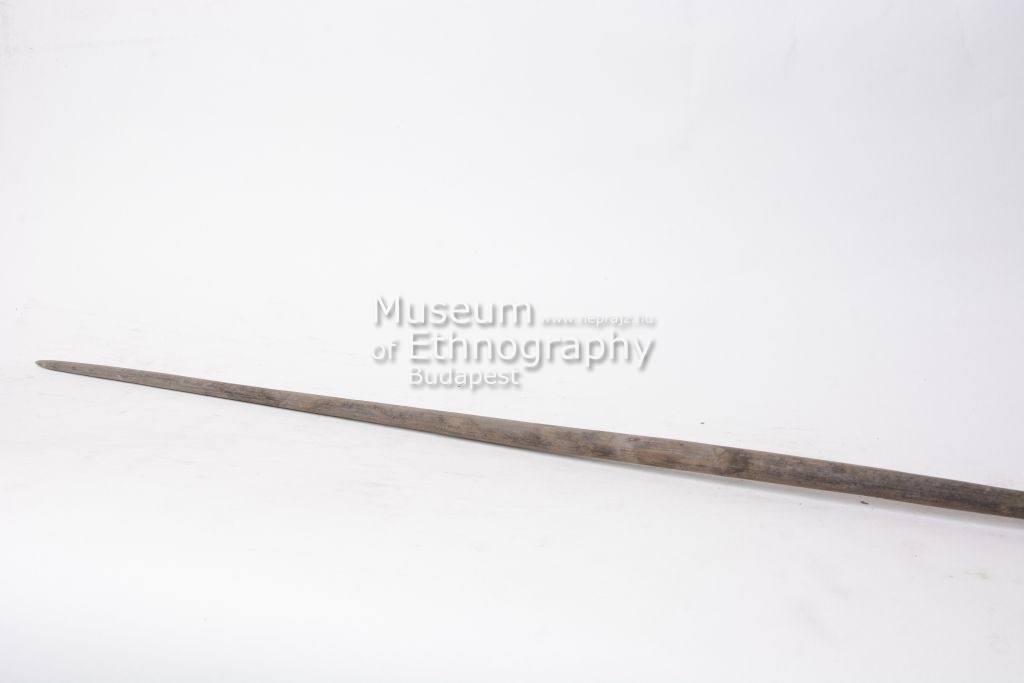 Kétrészes dárda. A sárgás-barnás színű bambuszszárba háncsszalaggal rögzítették a fából faragott hegyet. A száron 14,5 cm-es sávban körbefutó geometrikus díszítés található.
