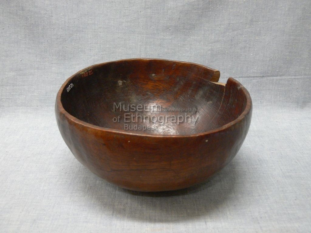 Kerek, vöröses színű, kemény faanyagból faragott, díszítetlen fatál.