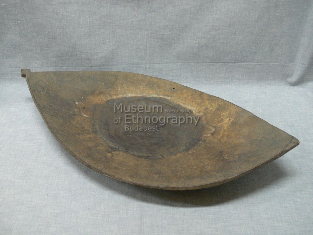 Hosszúkás ovális alakú, csúcsban összefutó végű, egyik végén durván faragott kis, fogószerű résszel ellátott fatál. Szürkés-barnás színű. Díszítetlen, lapos.