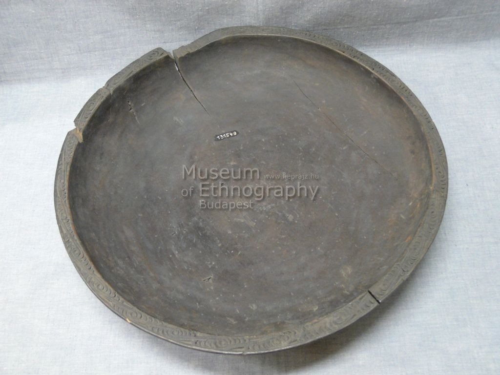 Kerek, lapos, barnás-vöröses színű, peremén vájt díszítéssel ellátott fatál. Repedezett.
