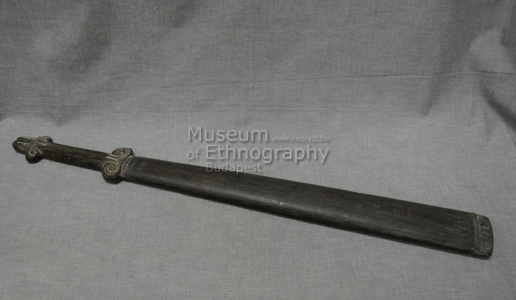 Fából faragott, lapos, feketés színű, kard alakú tárgy, markolat részén, egyik oldalon, alul és felül vésett hurokvonalas ornamentikával.