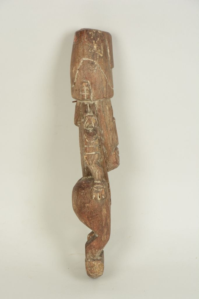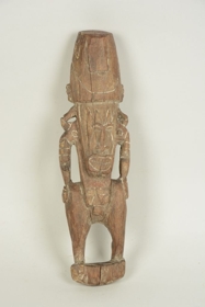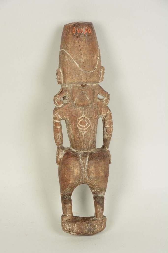 Barnás színű, keményfaanyagból faragott, kis talapzaton álló férfialak. Combjai és fara erősen megvastagodott, penisét rövid csonk jelzi. Törzse hasábszerű, alul vízszintes vonalakkal díszített. Karjai a csípőre támaszkodnak, a felsőkaron a kardísz külön jelezve van. Vállán kétoldalt kör-alakú bemélyedés látható. Arcrésze a testhez képest aránytalanul nagy, arcvonásai kiemelkedően faragottak. Fogait fűrészfogszerű faragás mutatja, fülrészei áttörtek és a vállakkal együtt vannak kifaragva. Fejdísze csonka kúpos, körbefutó magányos hullámvonallal díszített. A mélyített vonalaknál helyenként fehér inkrusztálás nyomai látszanak.