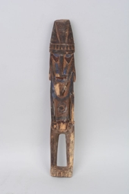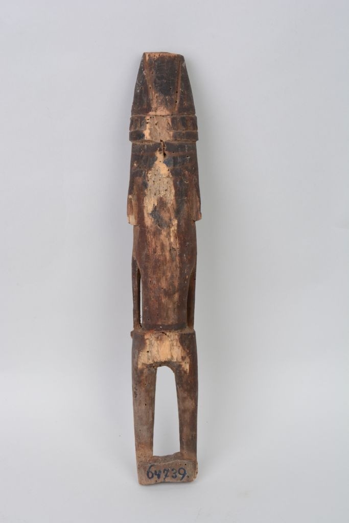 Puha, sötétbarna színű, helyenként kékre festett fából faragott hosszúkás, lapos, téglalap alakú emberalak. Lábai alul keskeny talapzattal együtt vannak kifaragva, kezei a csípőre támaszkodnak s az egyiken három, a másikon négy ujj látható. Arca hosszúkás, elnyúlt, lapos, orra kiemelkedő, száját és szemeit mélyített fűrészfogas és félhold alakú vonalak jelzik. fejdíszét körben elhelyezett heggyel lefelé fordult háromszögekből álló sáv díszíti. fülbevalói csak elnagyoltan vannak kifaragva. Törzsén elöl középen mélyített kör alakú faragás van.