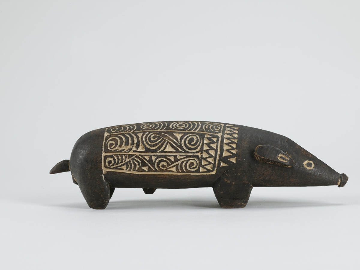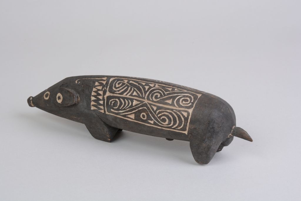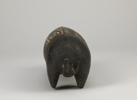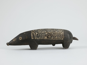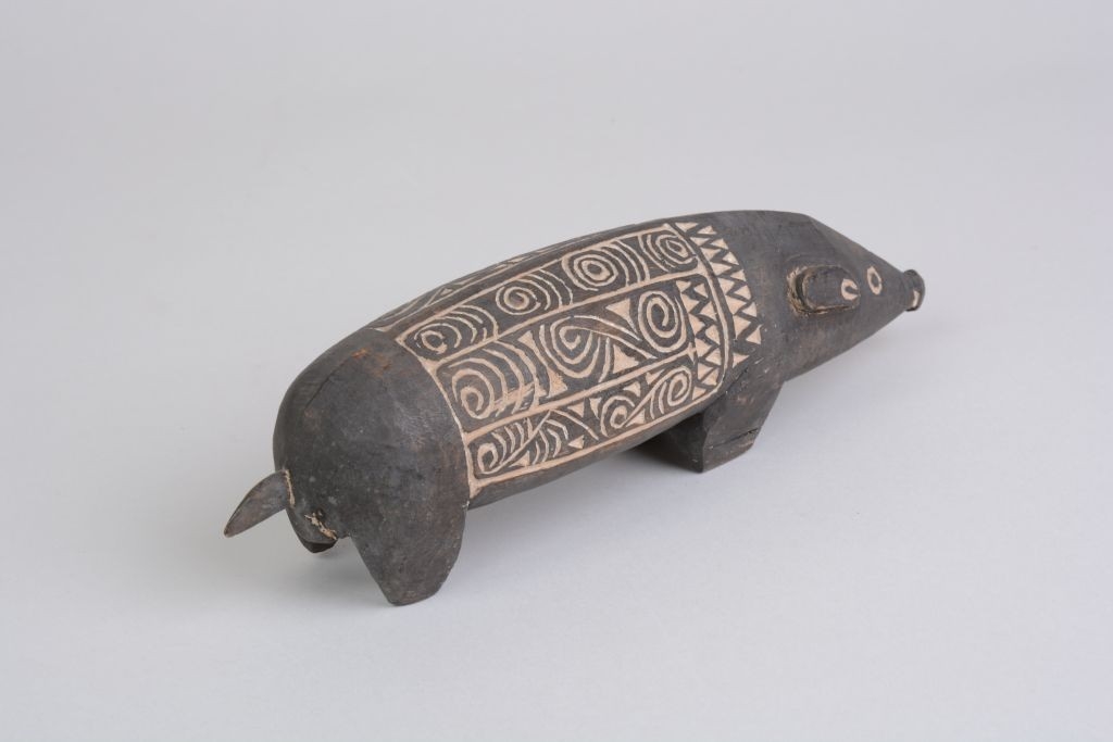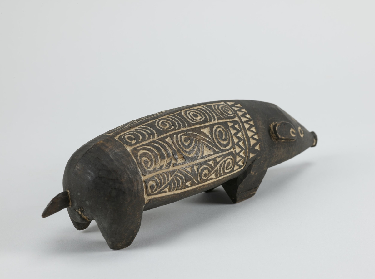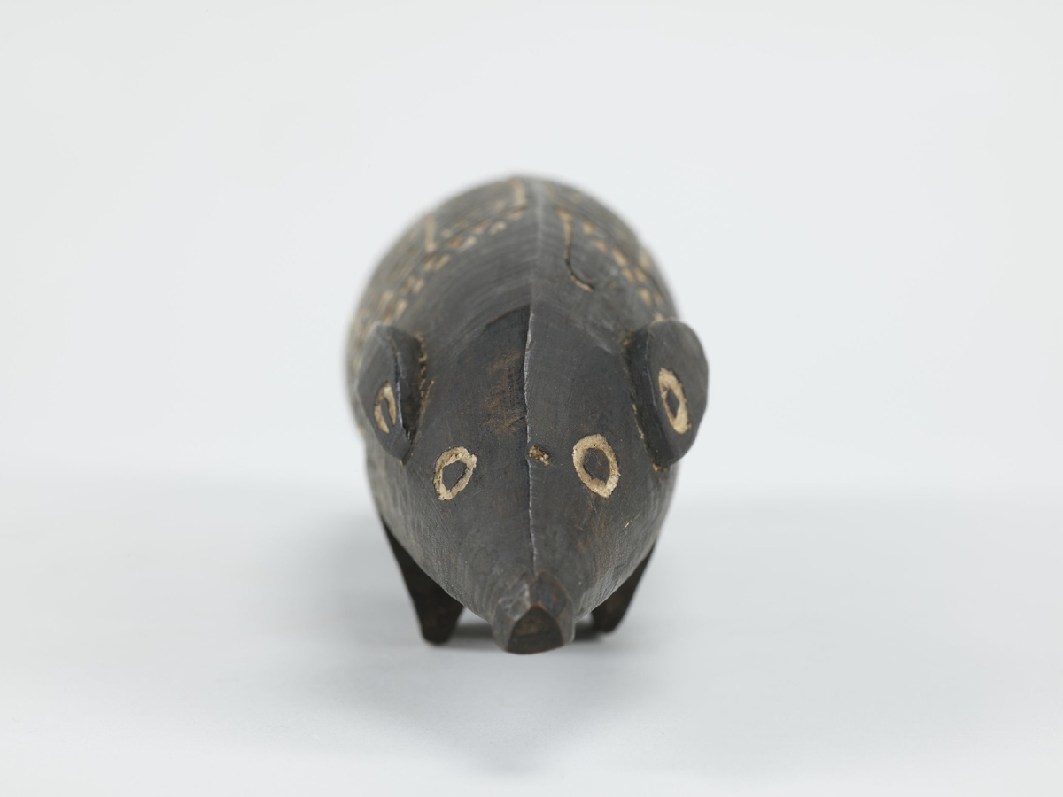 Kemény faanyagból faragott, feketés színű disznóalak, hátán két mezőben elrendezett hullámvonalas, körök és összefonódó ívek vésetekkel. A mélyített részek mészporral vannak fehérítve.