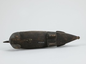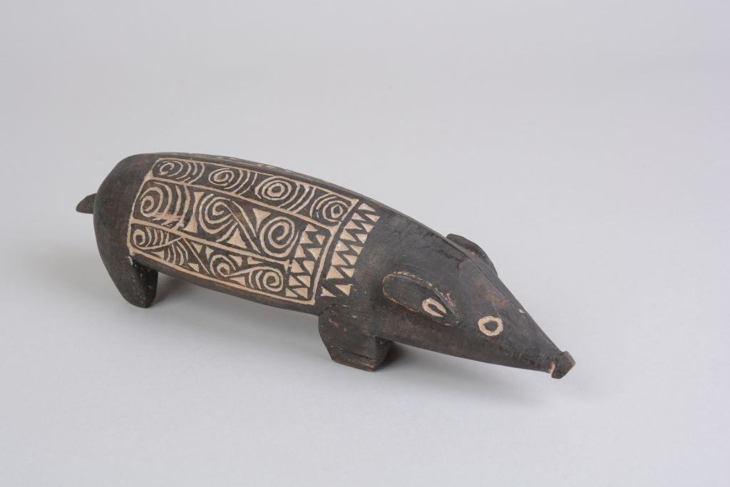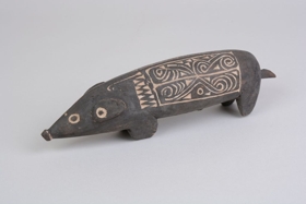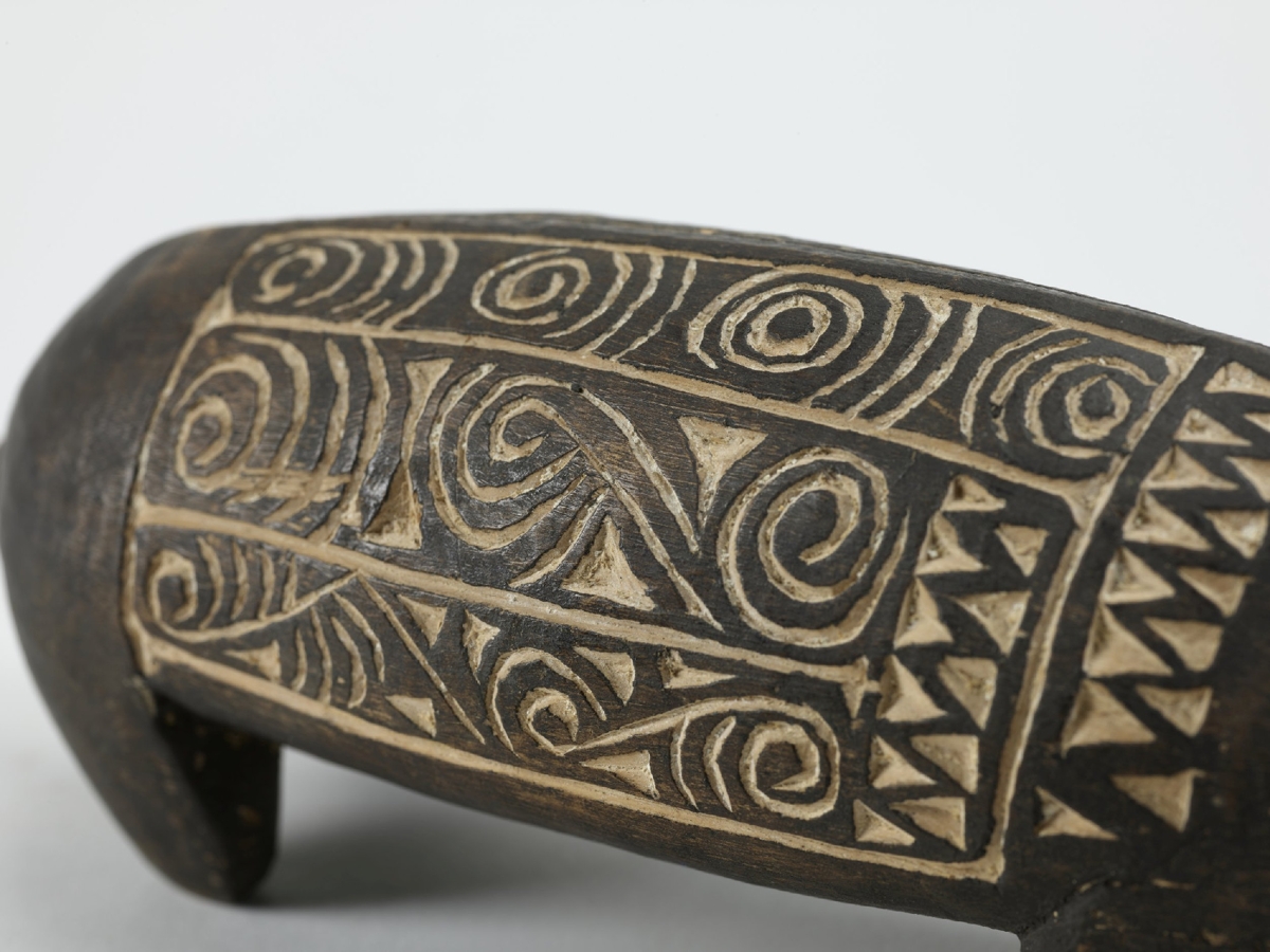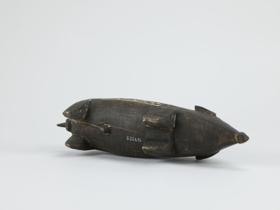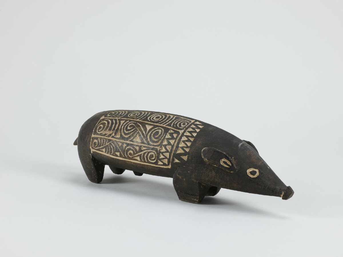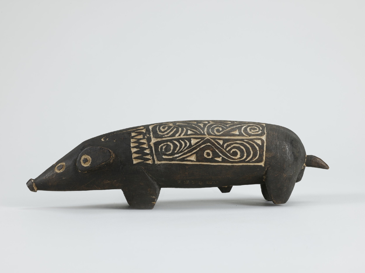 Kemény faanyagból faragott, feketés színű disznóalak, hátán két mezőben elrendezett hullámvonalas, körök és összefonódó ívek vésetekkel. A mélyített részek mészporral vannak fehérítve.