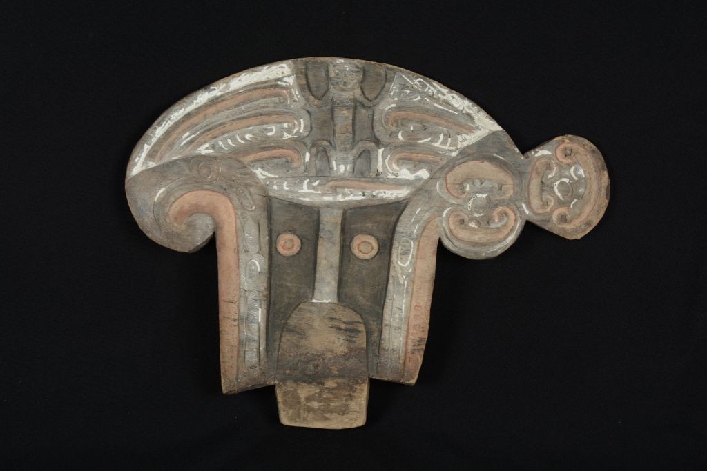 Kemény faanyagból faragott, barnás színű, négyzetes alakú lapos tárgy. Elülső oldalát reliefes és mélyített vonalakból, körökből és oválisokból álló díszítés fedi, hátsó oldalán két vájat húzódik. Színezése: váltakozva fehér és vöröses. A díszítések között felül középen felfelé tartott kezű emberalak van.