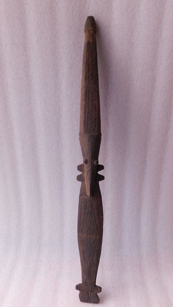 Puha fából faragott, hosszúkás, barnás színű tárgy, mely halba harapó állatot /hal? krokodil?/ ábrázol. A hal lapos, egyik oldalán vésett fűrészfogsorokkal és hullámvonalakkal díszített; a másik állat szája nyitott, teste szögletes. A fejrészen a szemek gombként kiemelkednek, a szögletes gúla alakú, csúcsban végződő test három oldalon vésett hullámvonalakkal díszített.
