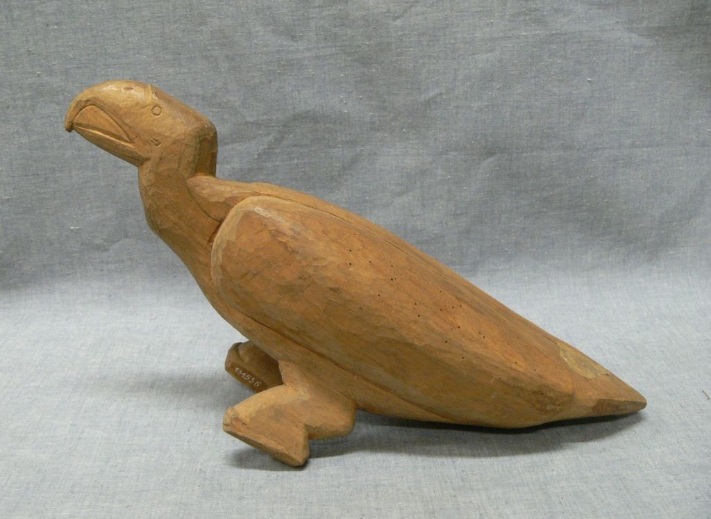 Kemény faanyagból faragott, világosbarnás színű madár, sas alak. Teste tömör, kissé megnyúlt. Feje kidolgozott, vésett, lábai elnagyoltak. Kloákája jelzett. Hasán hosszú repedés
