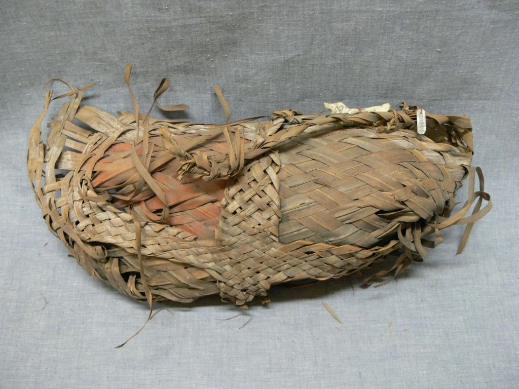 Kókuszlevélből font kosár átlós szálfutású vászonkötéssel. Hosszúkás, csónak alakú test a csúcsból kiinduló függesztő szárral, alul kereszt alakú alsó hevederrel. Egy helyen vörösre festve.