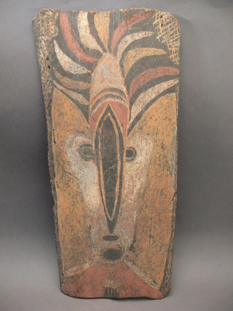 Avatási ház mennyezetét díszítő, elnyújtott emberi arcot ábrázoló festett kéreglap.