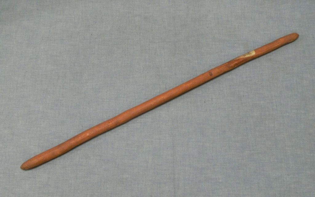 Vörösre színezett, enyhén kihegyezett végű természetes bot. Vésett, geometrikus minták díszítik. Papír felirat:Yumu (?yuru) Arterkitól (?) északra kuntong(b)a pata