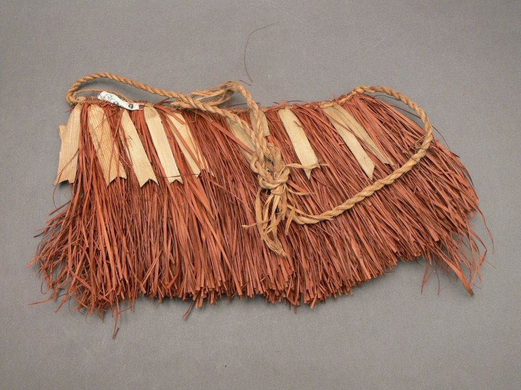 Világosbarna rostból sodort fonalra felerősített vöröses színű, növényi háncs szálakból készített dísz. Mintha fűszoknya lenne. A rost fonat két oldalt folytatódik. A vastag vörös háncs réteget rövidebb világosbarna szélesebb lapos barna levelek díszítik a tárgy mindkét oldalán