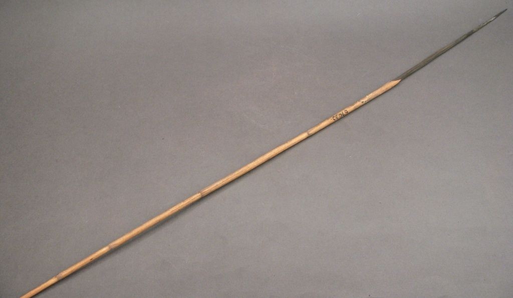 Hasított bambusz szárba illesztett keményfa hegy. Gyermekjáték.