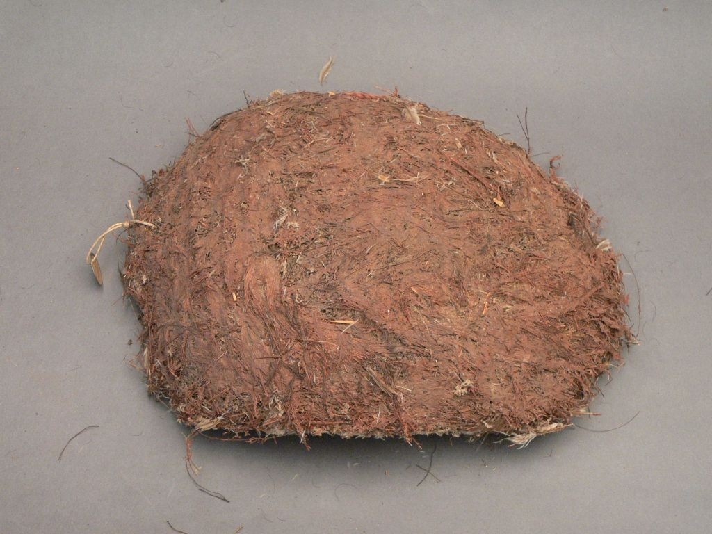 Lapos, félgömb alakú kemény tárgy, tetején vörös festék maradványaival. Kívülről mindenütt vastagon rövidebb madártollak fedik, belül valószínűleg növényi anyag van