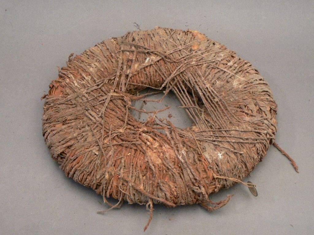 Emu szíve, kunian gambu nevű tárgy. Középen lyukas, kőr alaprajzú világos tárgy, amin az alapanyag rost zsinórral van betekerve