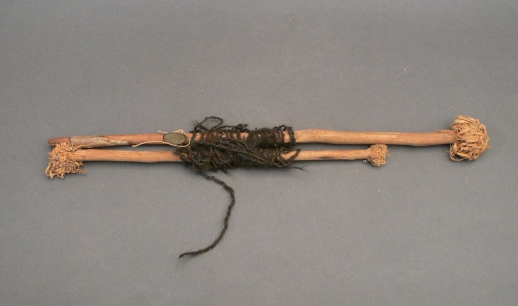 Két, eredetileg keresztbe fektetett faág, amelyeknek a négyből három vége díszítésként szálkásítva van. Ezeken eredetileg szabályosan feltekert emberi hajból sordrott fonal volt, amely rombusz alakot ad ki. A rombusz hegyei a pálcák végeihez estek. Jelenleg a pálcák egymás mellett vannak körbetekerve a hajzsinórral