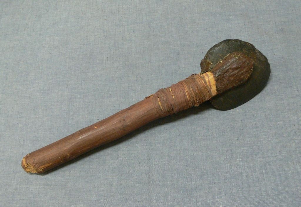 Vörösre festett vastagabb faág. Egyik vége durván lenyesett. Másik végéről középen bevágás indul, egész az ág közepéig el van repedve. Ebbe van beszorítva egy fekete, lapos, ívelt hegyű, nagyjából háromszög alakú kő, amelyre él van faragva. Ezt vöröses háncs rögzíti, mely a fával együtt lett festve és helyenként elmozdult.