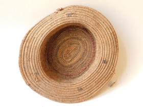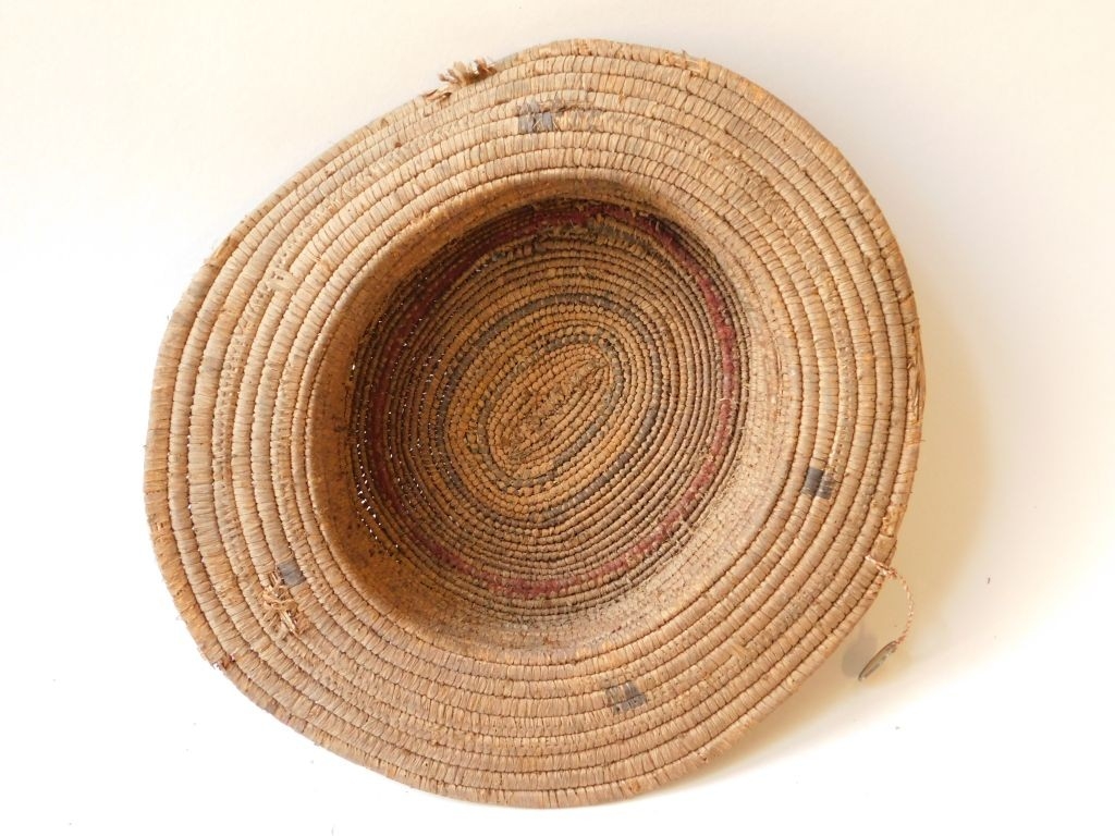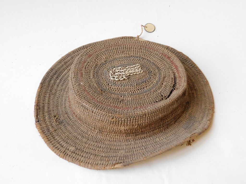 Háncsból font, sárgás színű kalap, fekete és piros csíkokkal. Oldala alacsony, pereme vízszintesen fut. Tetején három egész és egy fél csigahéjsor díszíti. Pereme és a tetején egy kis részen szakadozott.