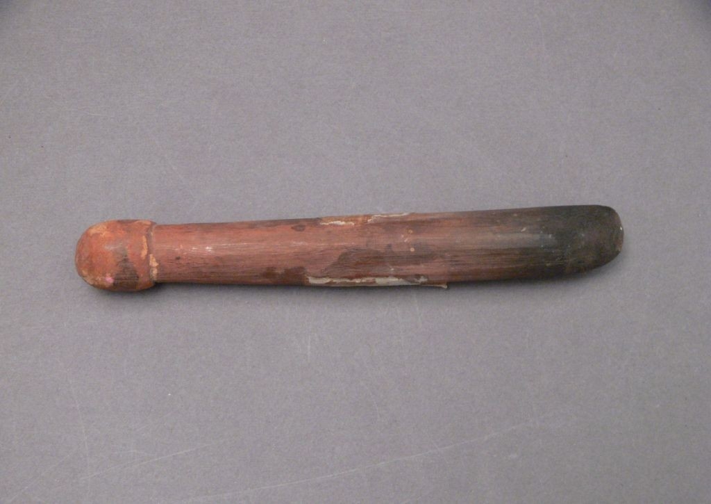 Szerelmi ráolvasásra való 'wawilia'. Hengeres fadarab, egyik vége feketés, másikon kisebb fogó. Ráragasztott papíron 128-as szám