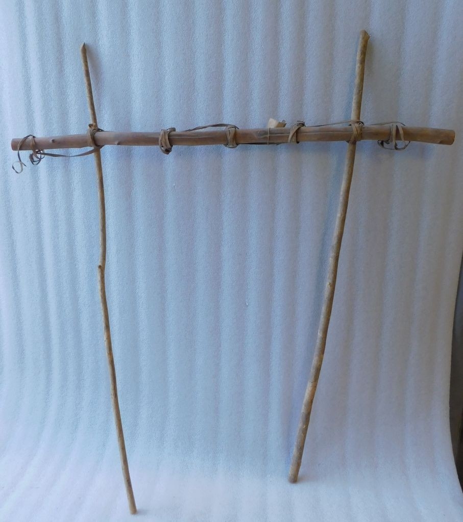 Két függőleges hengeres bot harmadához egy harmadik, vastagabb hengeres bot van vízszintesen felkötözve, úgy, hogy a végei túllógnak. A keresztrúdon több helyen háncscsík tekervény, amelyek közt háncs csík fut lazán