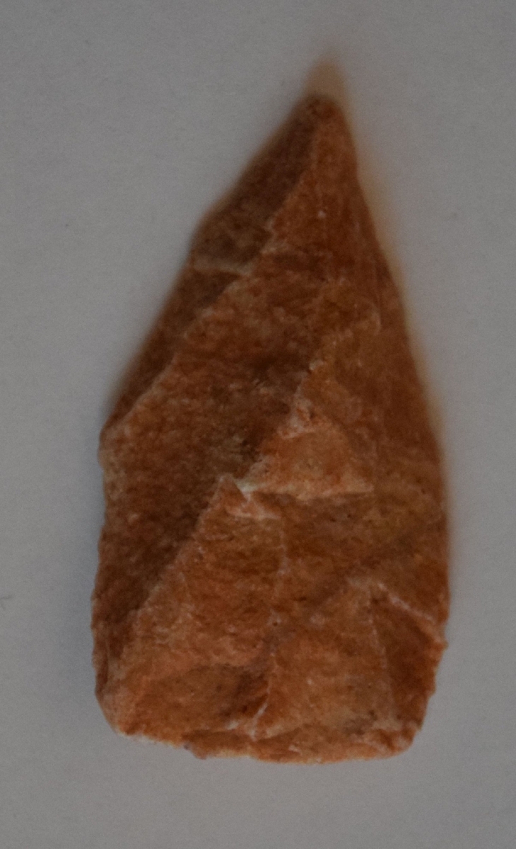 A debitázstengelyre szimmetrikus, sub-trianguláris keresztmetszetű hegy. Az enyhén ívelt jobb oldalél mintegy 37 mm hosszan finoman retusált.