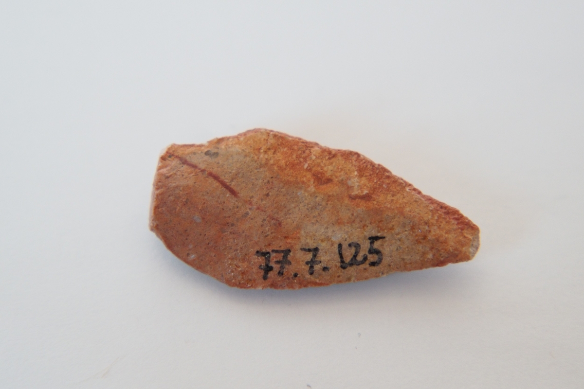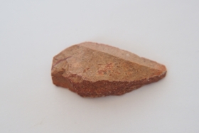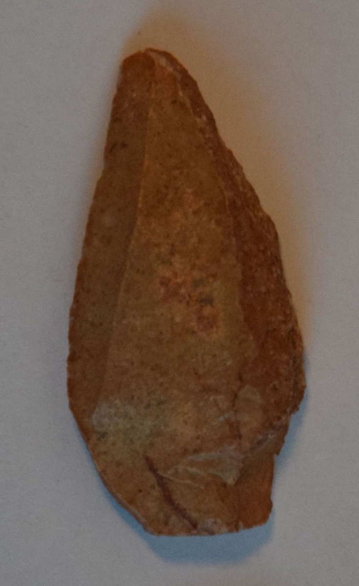 Sub-trapezoid keresztmetszetű hegy, a debitázstengelyre szimmetrikus elrendezéssel. Az előlap jobb oldalán, az oldalél mentén az erodált külső felszín, hegye nem régen letörött, a törésfelület patinátlan.