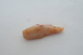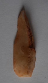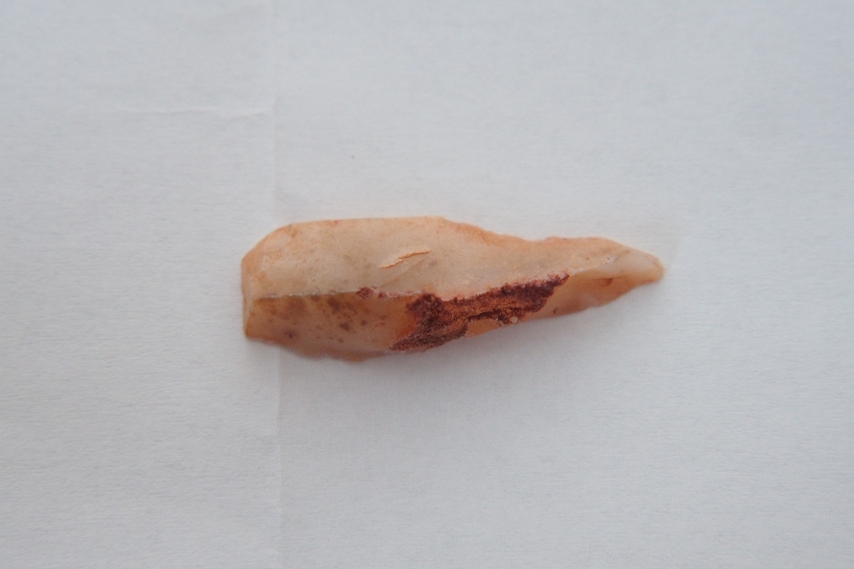 sub-trianguláris keresztmetszetű keresztmetszetű hegy a debitázstengelyre megközelítőleg szimmetrikus elrendezéssel. Jobb oldalélén az erodált külső felszín részleges nyoma. Bázisa szándékosan, egyenes vonalúan tört; baloldalán apró leválasztásokkal lekerekített.