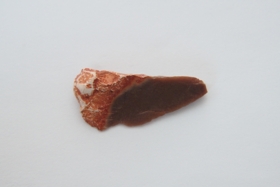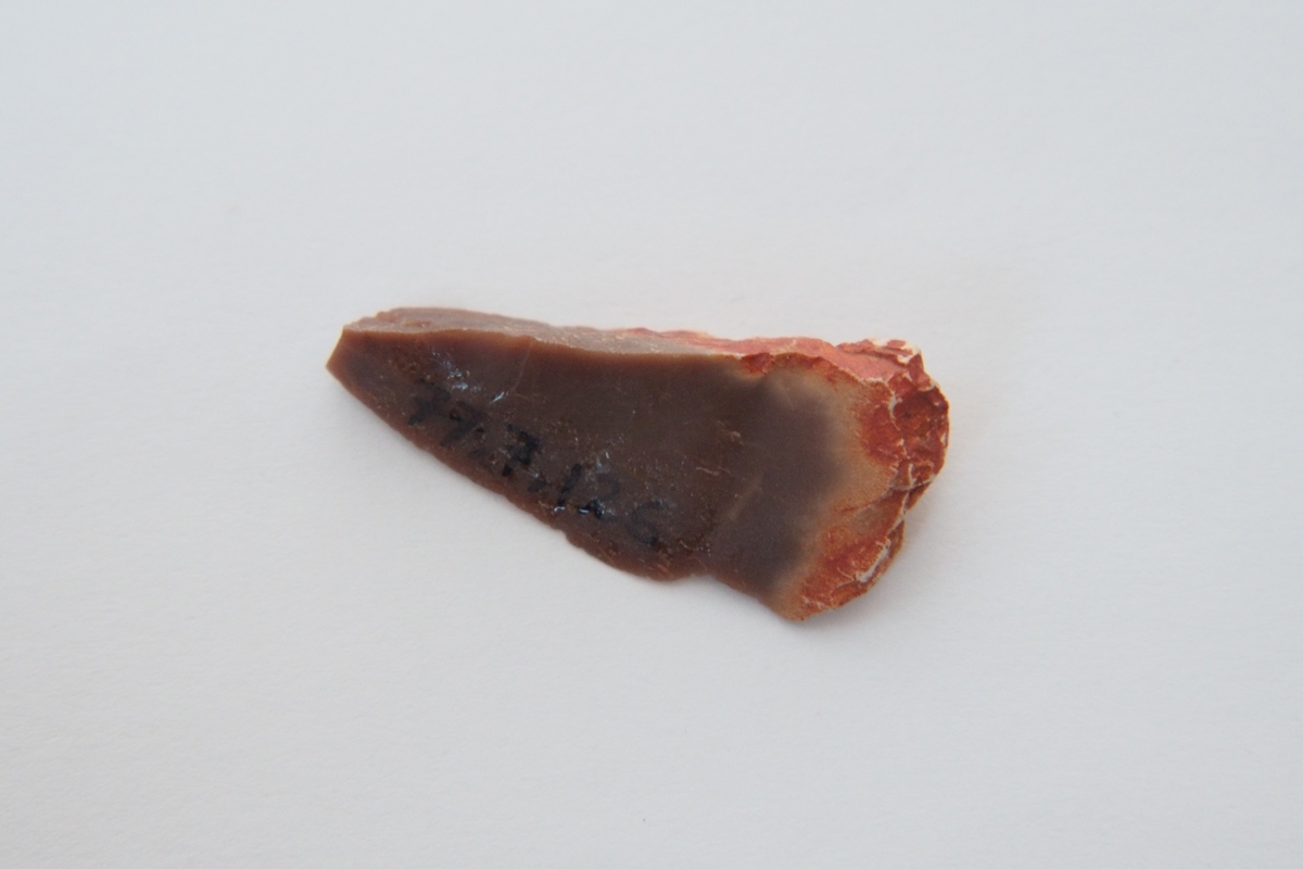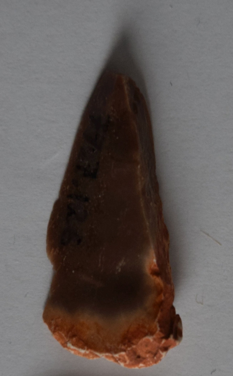 Sub-trianguláris keresztmetszetű hegy. Bázisán az erodált külső felszín, bal oldalélén a részben erodált természetes külső felszín részleges nyoma. Hegye régen törött.