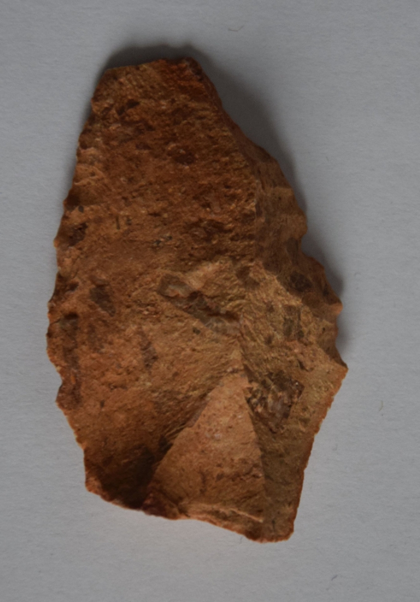 Szabálytalan keresztmetszetű retusálatlan hegy a debitázstengelytől balra elhajló hossztengellyel. A hegye nem régen törött.