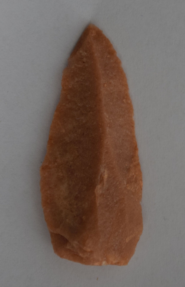 A debitázstengelytől enyhén balra elhajló, sub-trianguláris keresztmetszetű, retusálatlan hegy.