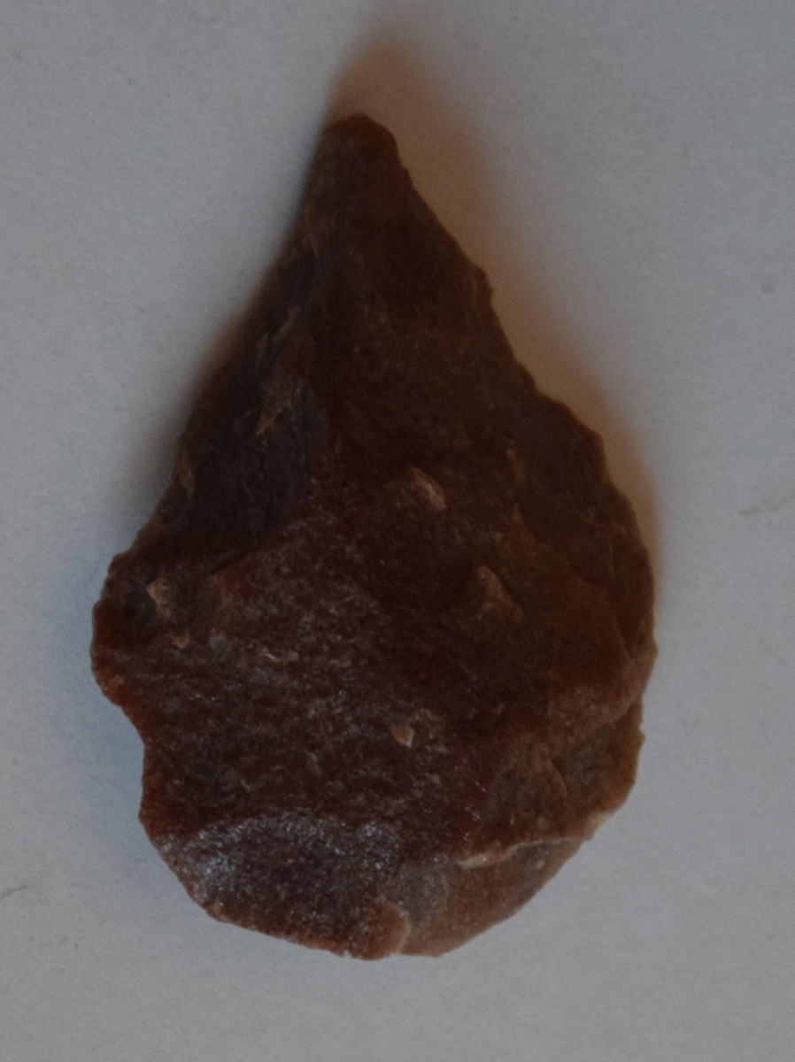 A debitázstengelytől enyhén balra elhajló, sub-trianguláris keresztmetszetű hegy. A szabálytalan vonalú oldalélek elnagyoltan retusáltak. A hegy lekerekített.
