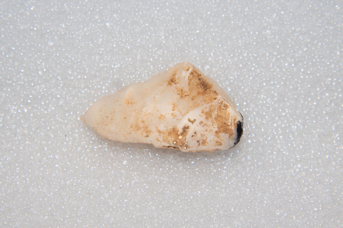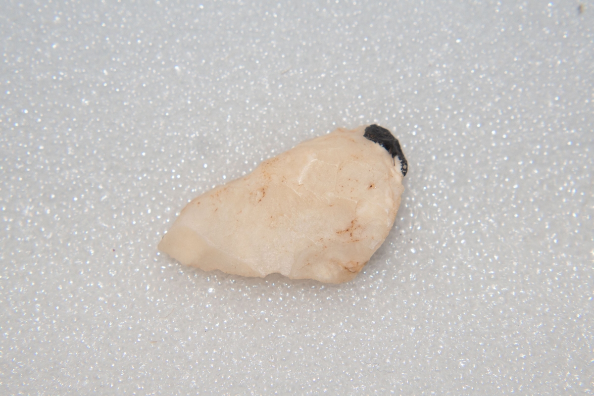 A debitázstengelytől erősen (kb. 25°) balra elhajló, szabálytalan keresztmetszetű hegy. Az enyhén ívelt vonalú oldalélek elnagyoltan retusáltak. Proximális végén, a bázis jobb sarkában a nyelezést elősegítő fekete, kátrányszerű ragasztó anyag nyoma.