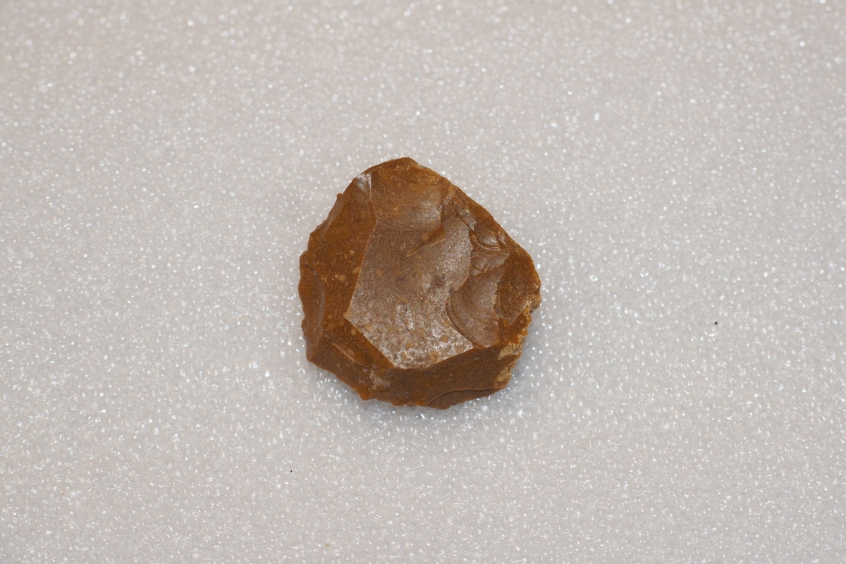 A debitázstengelyre megközelítőleg szimmetrikus, szabálytalan keresztmetszetű szilánkon készített atipikus vakaró. A bal oldalél proximális végén erodált külső nyersanyagfelszín maradványa. A jobb oldalélen rövid szakaszon félmeredek retusálás.