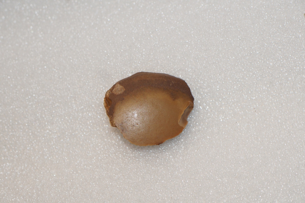 Kavicsból készült kisméretű, lapos, ovális alakú 'vakaróeszköz'. Alsó lapja az eredeti patinás kavicsfelszín; a felső lap bal oldalán, középtájt szintén kis kavicskérges terület. A teljes pereme mentén félmeredek retusálás, illetve intenzív használati nyomok (kipattogzás) láthatók.