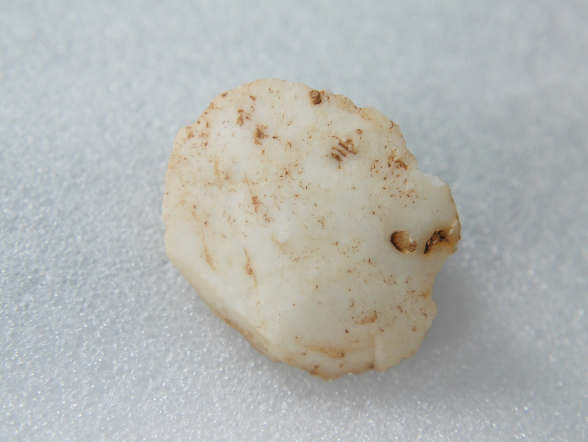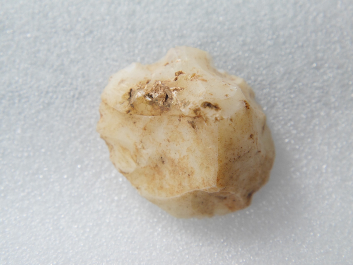 A debitázstengelyre megközelítőleg szimmetrikus, szabálytalan keresztmetszetű, vaskos szilánkon készült vakaró. Előlapján nyersanyagzárvány részleges maradványa. Disztális végén és az oldaléleken lamelláris leválasztások és elnagyolt retusálás.