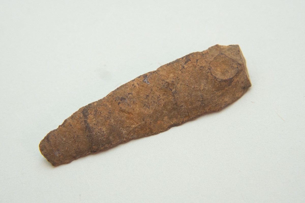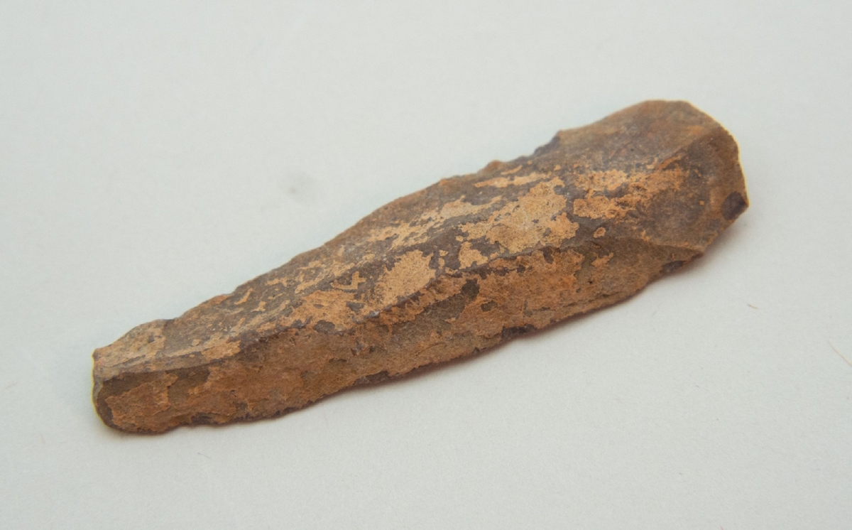 A debitázstengelyre szimmetrikus, sub-trapezoid keresztmetszetű, enyhén ívelt oldalélű, retusálatlan penge. Felülete vöröses színű.