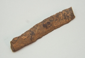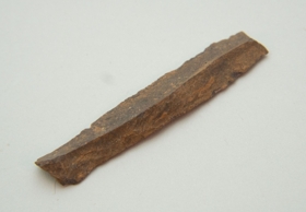 A debitázstengelytől enyhén jobbra hajló, háromszög keresztmetszetű, retusálatlan szilánk. Hegye/csúcsa régen törött. Az oldalélei megközelítőleg párhuzamosak. Felülete vöröses színű.