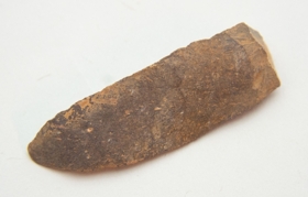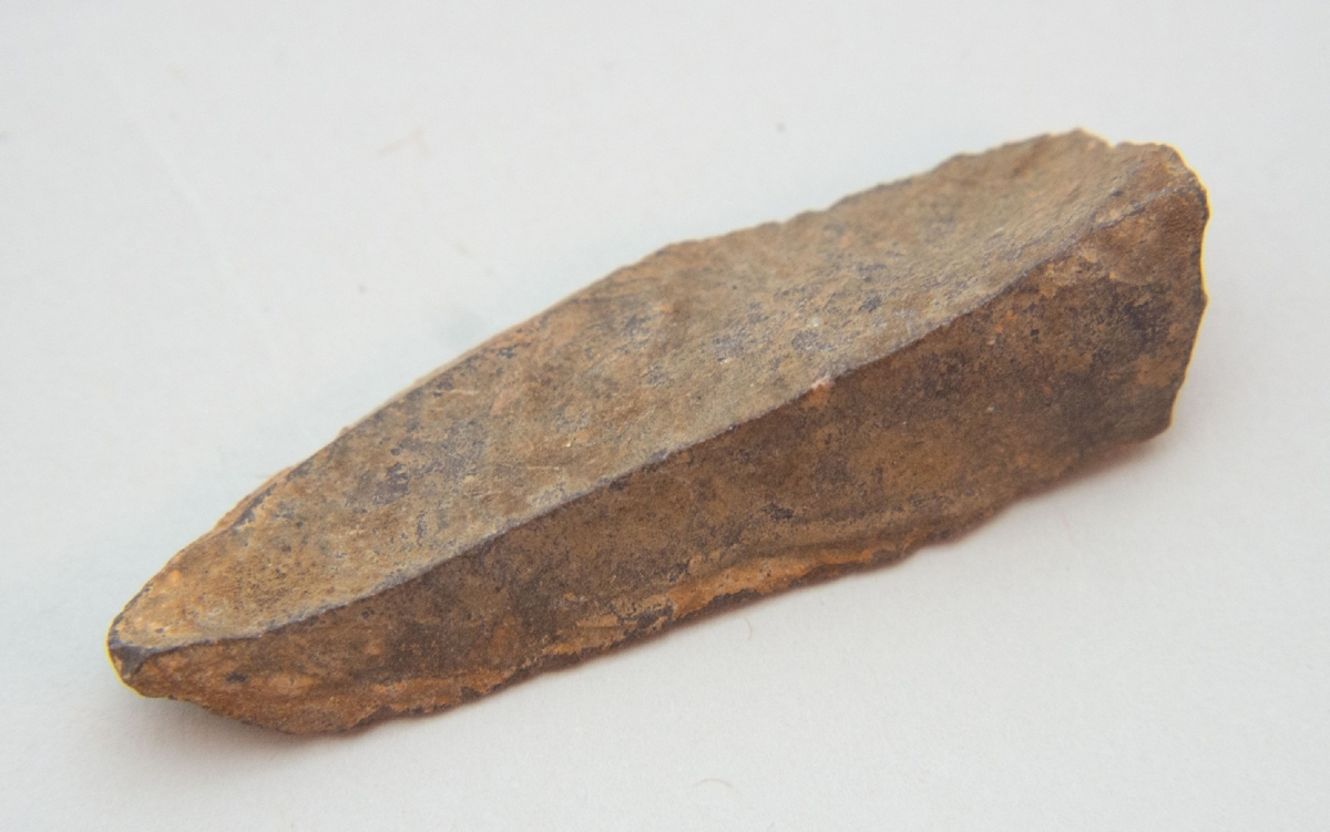 A debitázstengelytől enyhén balra hajló, aszimmetrikus háromszög keresztmetszetű, retusálatlan penge. Bal oldaléle egyenes vonalú; a jobb oldalél enyhén ívelt. Felülete vöröses színű.