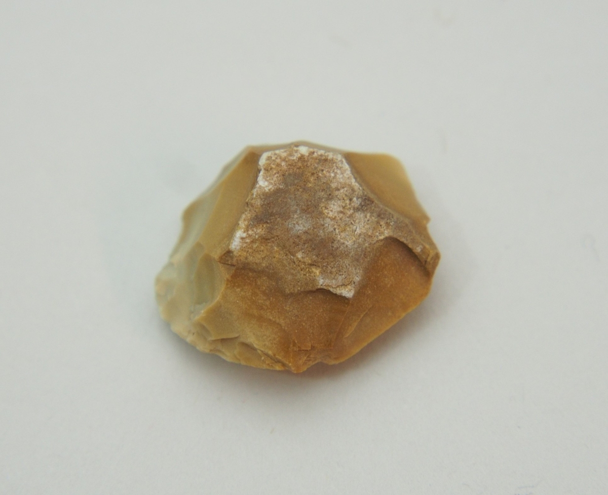 Kisméretű, sub-cirkuláris alakú lamella-magkövön készült vakaró. Az előlap közepén az erodált kavicsfelszín maradványa.